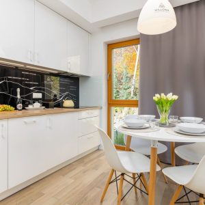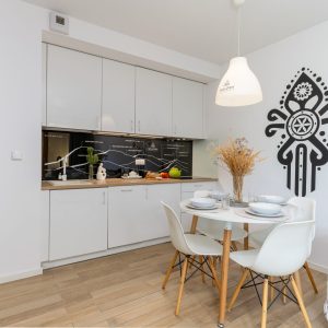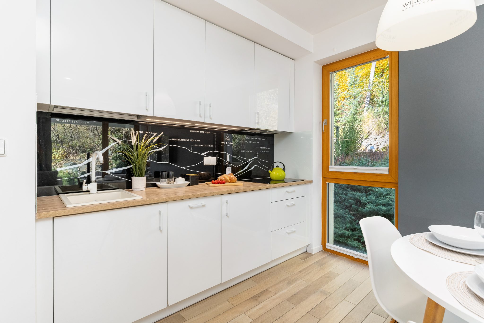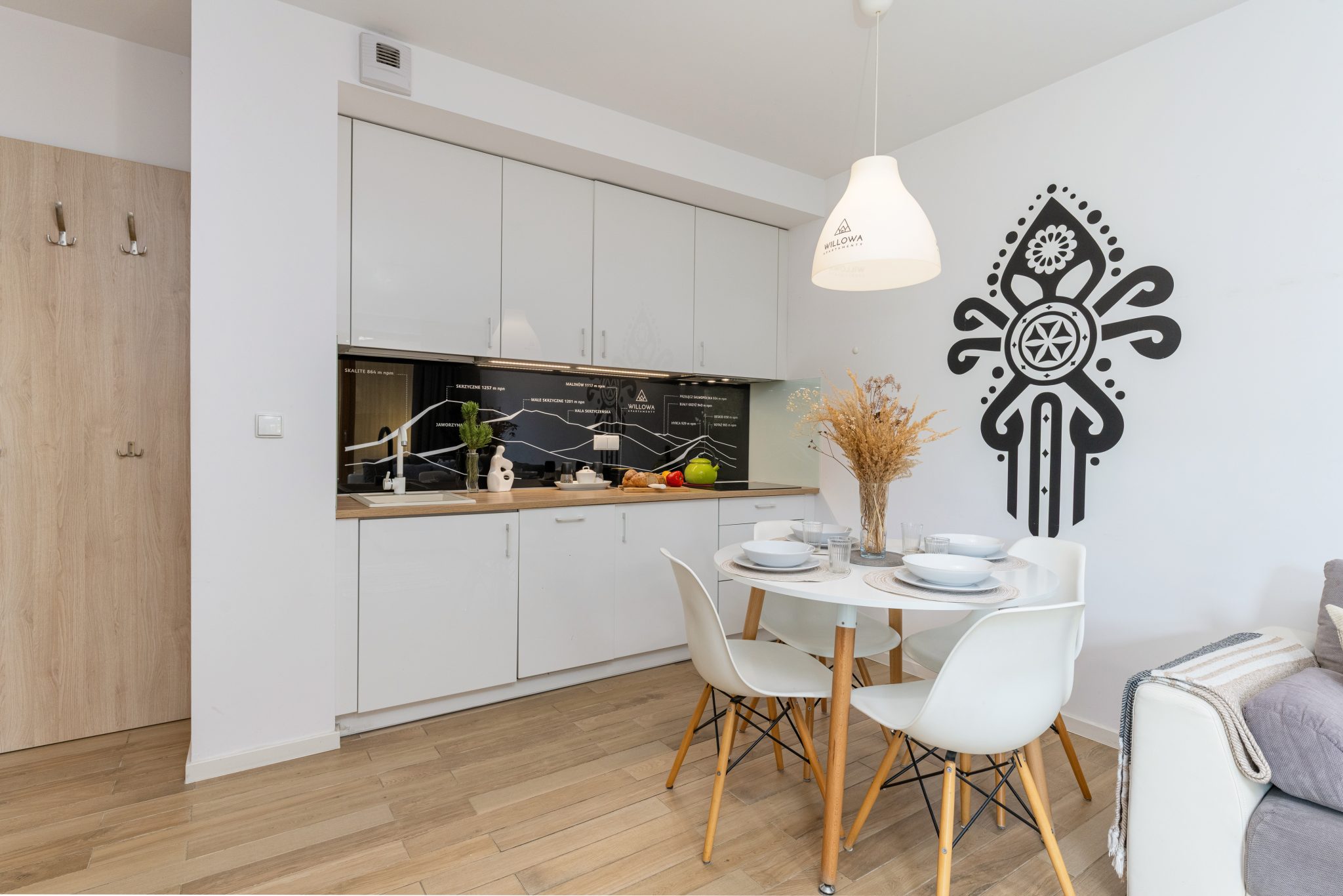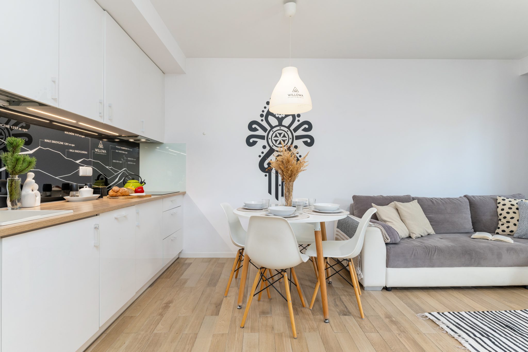 w pełni wyposażony aneks kuchenny, zawierający płytę indukcyjną, lodówkę, zmywarkę oraz wyposażenie kuchenne (garnki, talerze, sztućce i narzędzia do gotowania)