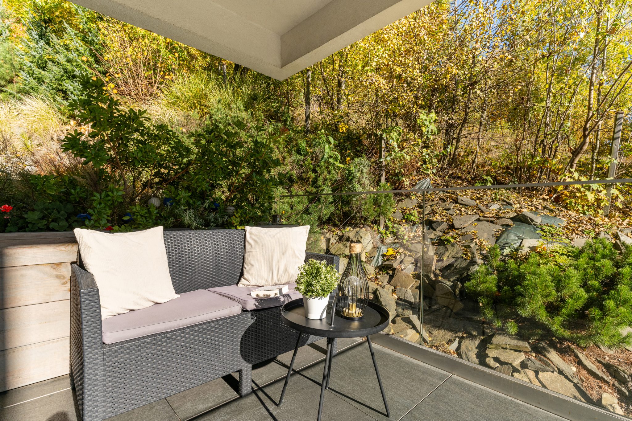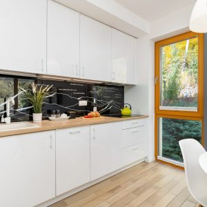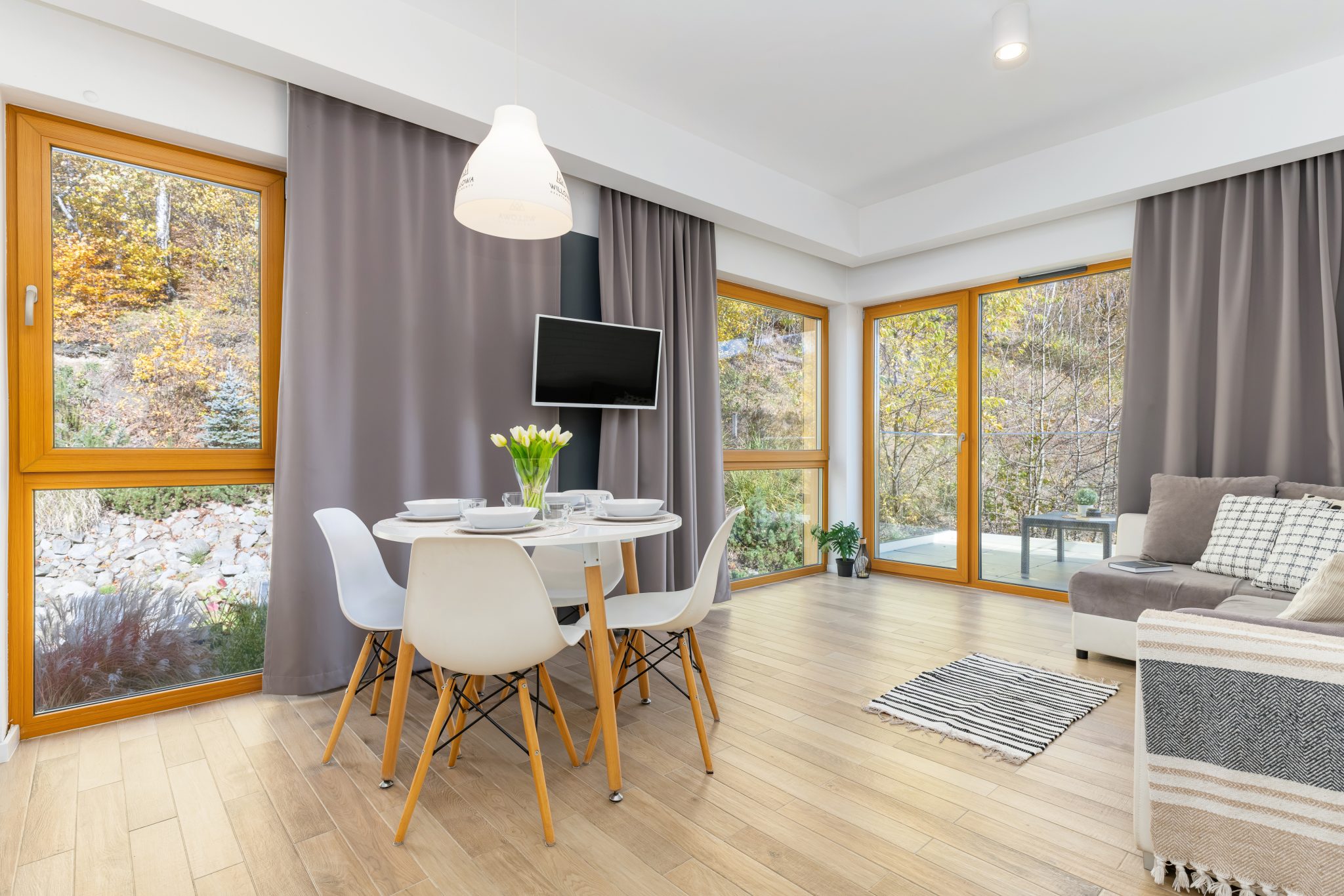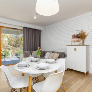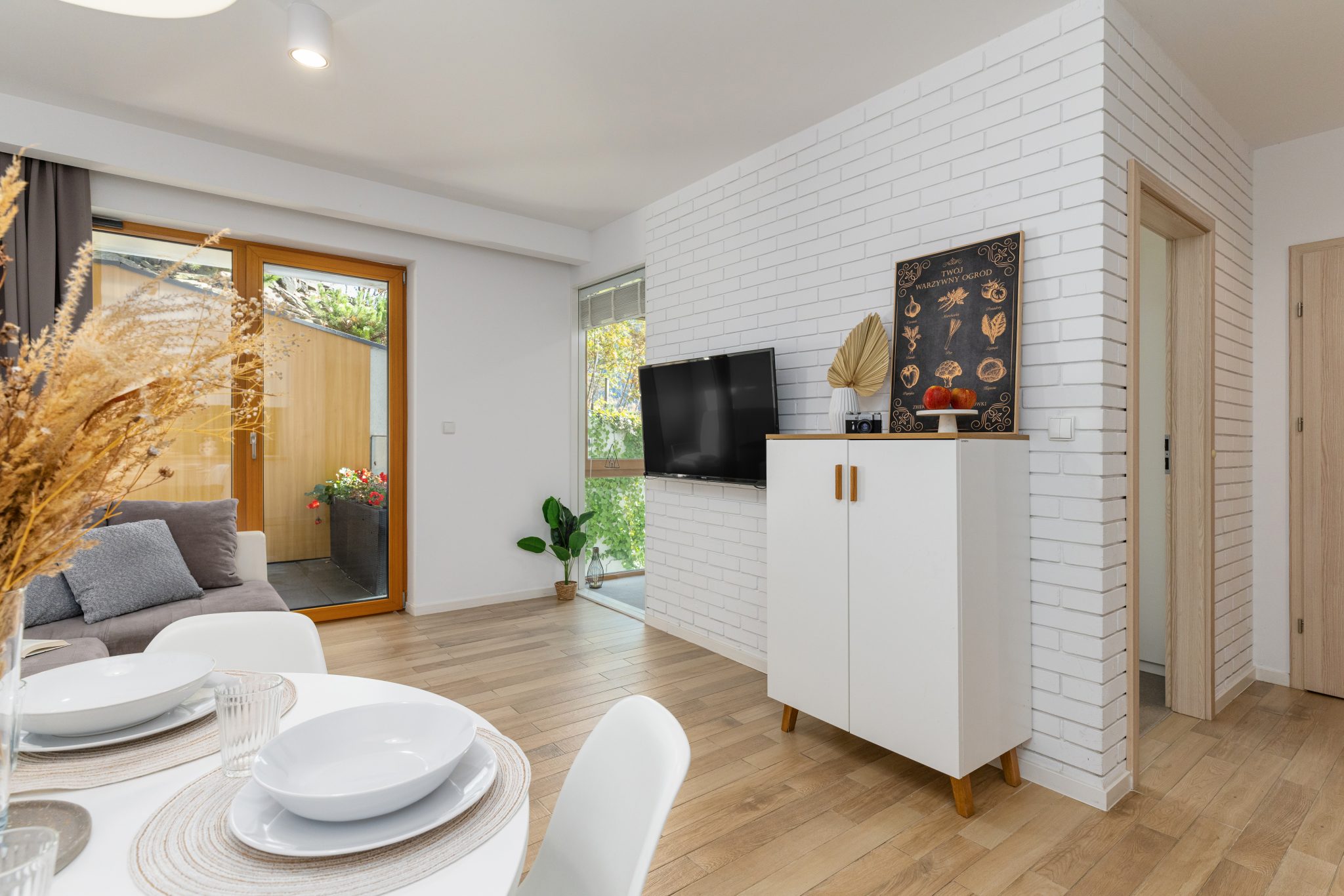 w pełni wyposażony aneks kuchenny, zawierający płytę indukcyjną, lodówkę, zmywarkę oraz wyposażenie kuchenne (garnki, talerze, sztućce i narzędzia do gotowania)