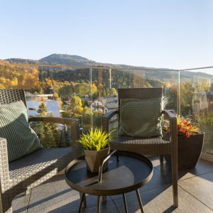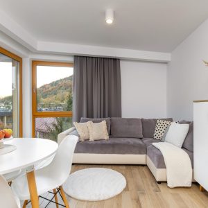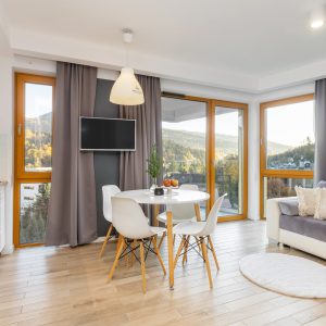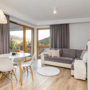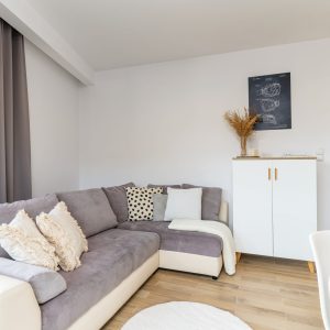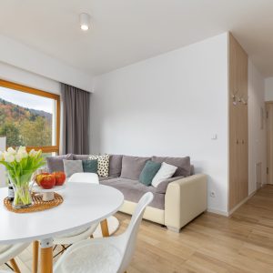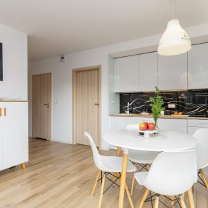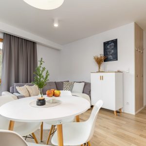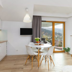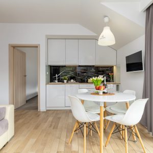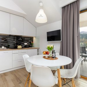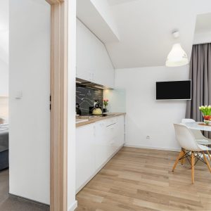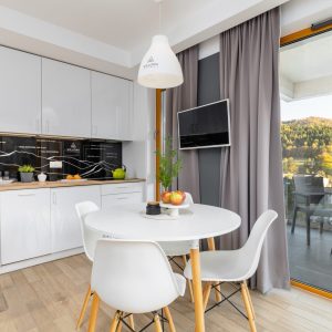 - w pełni wyposażony aneks kuchenny, zawierający płytę indukcyjną, lodówkę, zmywarkę oraz wyposażenie kuchenne (garnki, talerze, sztućce i narzędzia do gotowania)