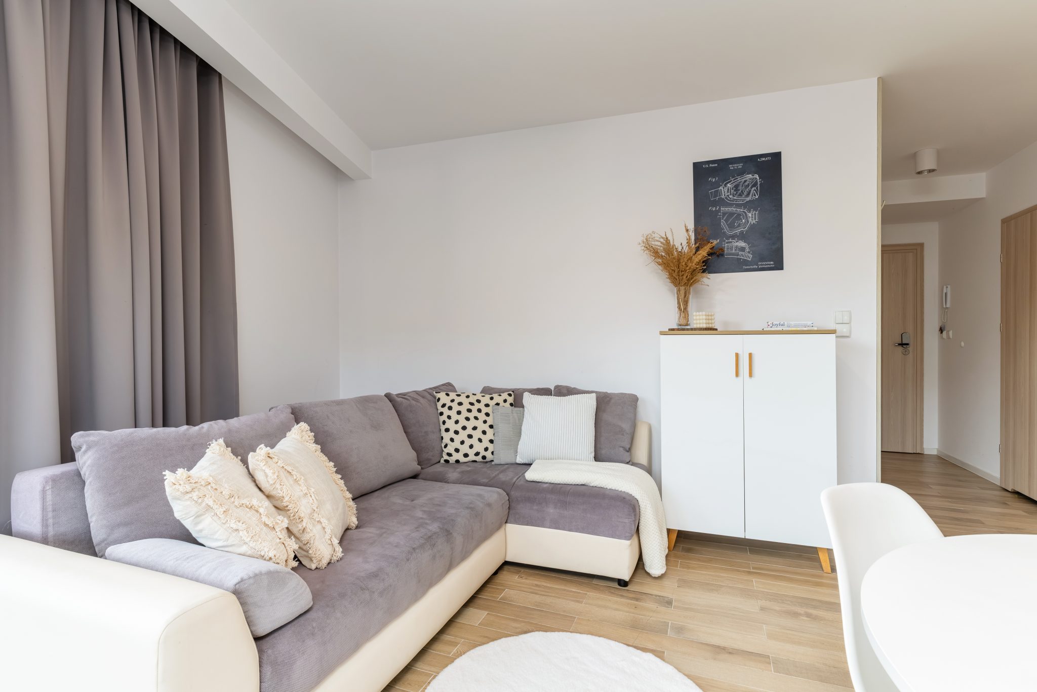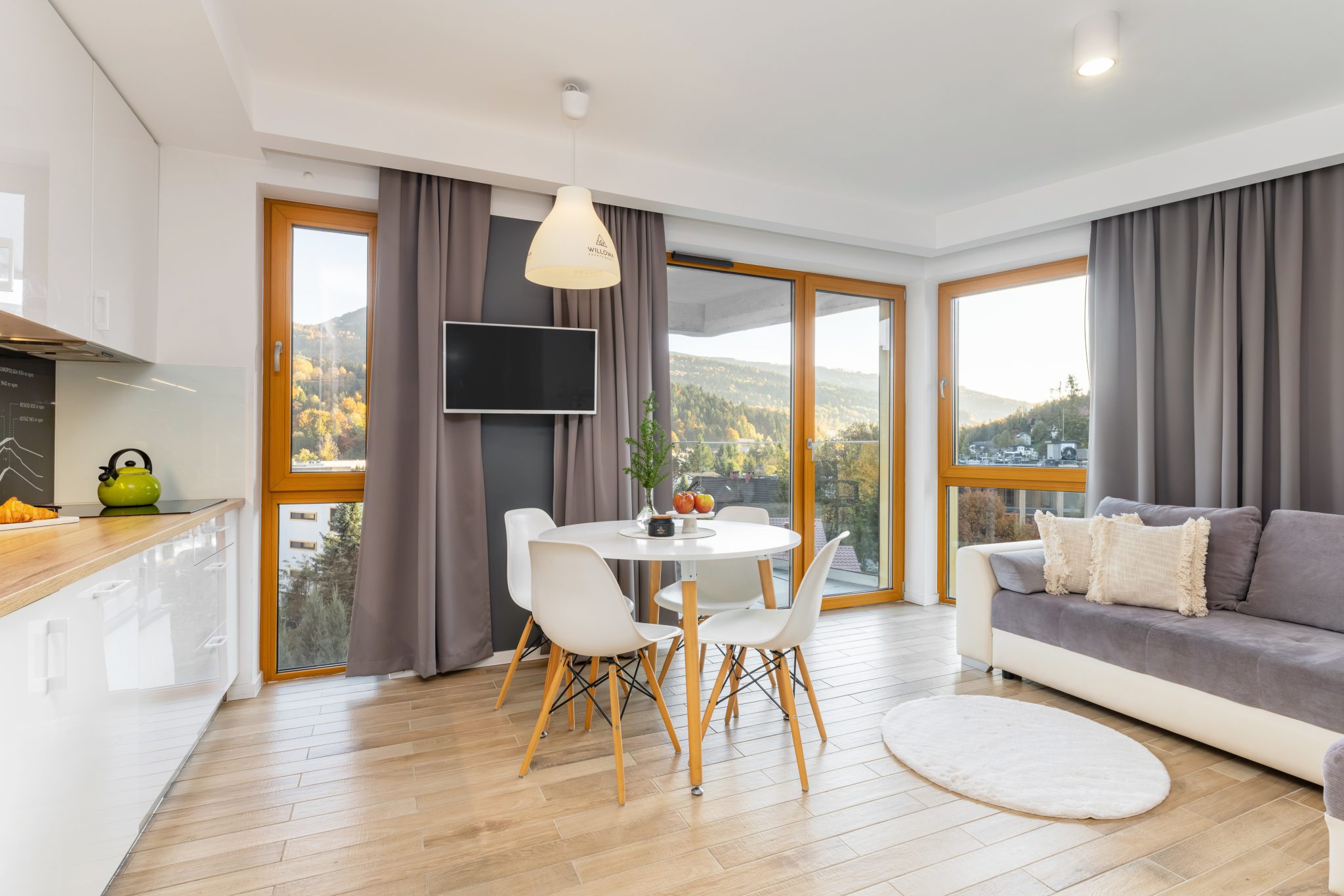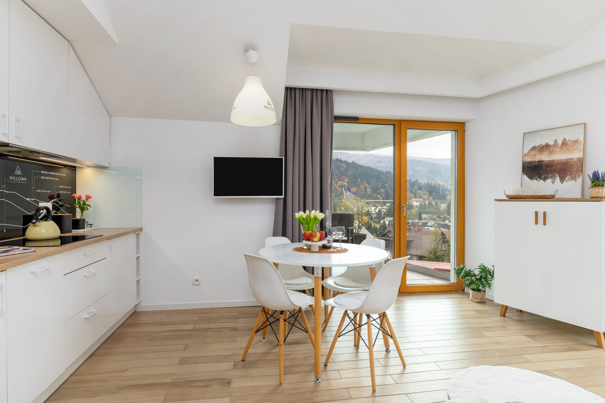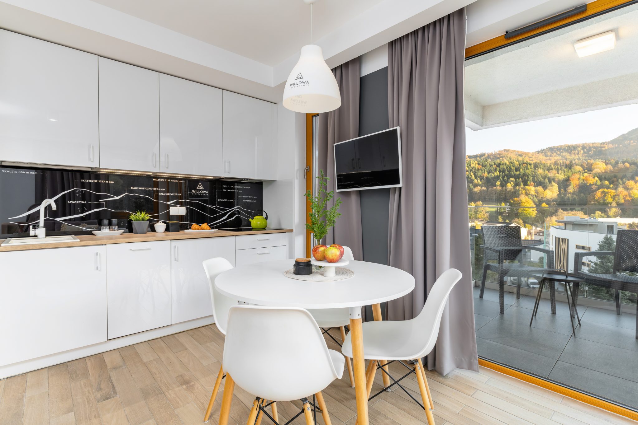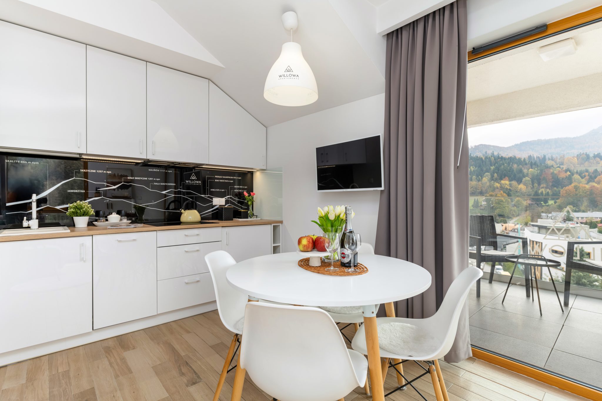 - w pełni wyposażony aneks kuchenny, zawierający płytę indukcyjną, lodówkę, zmywarkę oraz wyposażenie kuchenne (garnki, talerze, sztućce i narzędzia do gotowania)