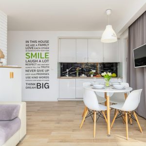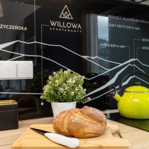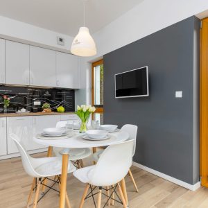 - w pełni wyposażony aneks kuchenny, zawierający płytę indukcyjną, lodówkę, zmywarkę oraz wyposażenie kuchenne (garnki, talerze, sztućce i narzędzia do gotowania)